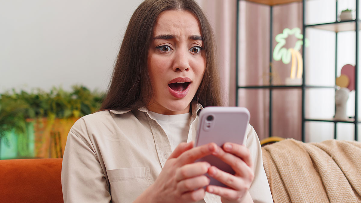 Young woman at home looking horrified while reading something on her smartphone about boyfriend abandoning girlfriend on date night