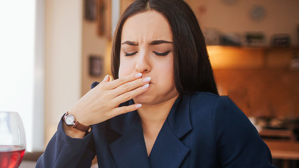 Woman reacting to soup with bone broth after friend slips it in, unaware of her meat allergy, showing discomfort and surprise.