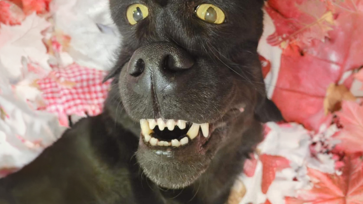 Close-up of a black dog’s face with bright yellow eyes and an unusual toothy expression that makes you look twice.