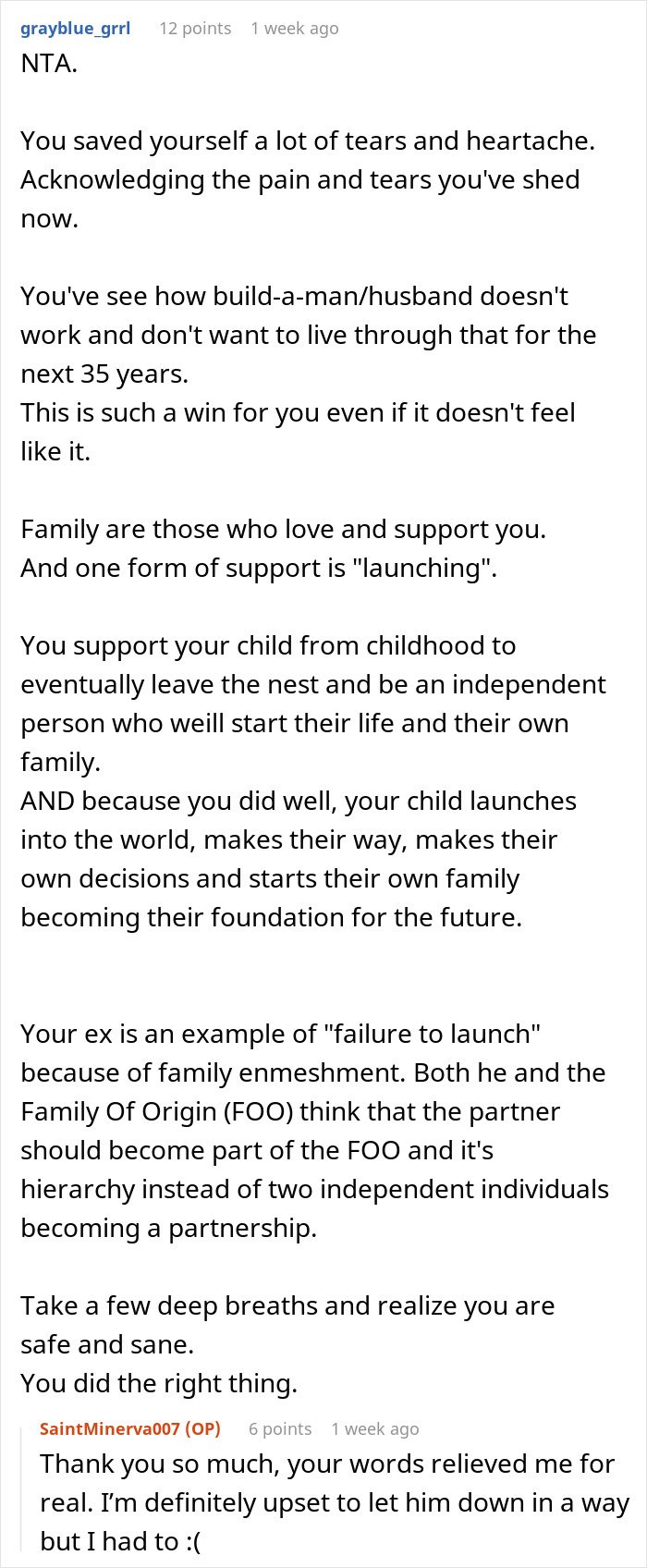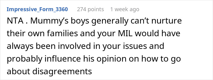 NTA. Smart woman, she walked away while she had the ability to do so. She would have been constantly tripping over his mother's apron strings otherwise. Not to mention the two being unable to become as one flesh with an umbilical cord still attached to Mommy.