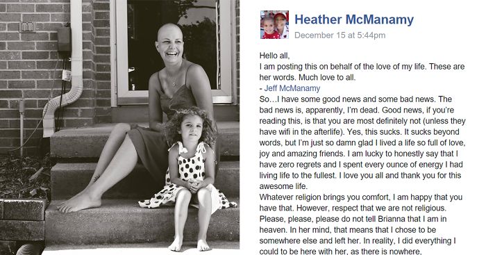 Heather McManamy is sending you a letter from her grave. This great mom was diagnosed with breast cancer in 2013. Now, at the age of 36, she passed away. But before that, she entrusted her husband Jeff with a letter he was to (and did) post on her Facebook.
