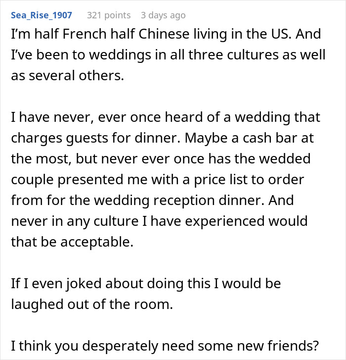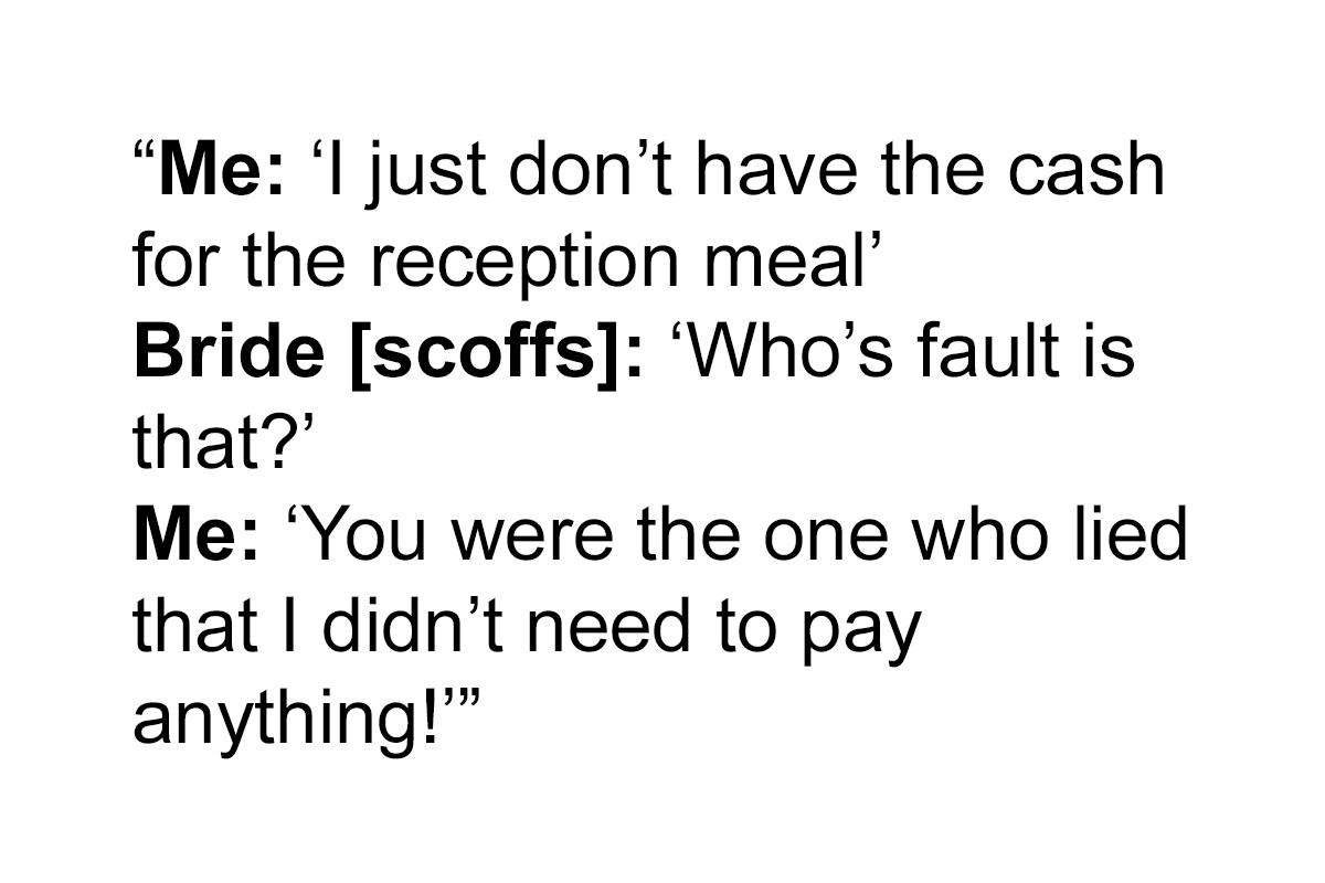 Load More Replies..."you are cheaper than I though" says the bride that literally charges people she invited.