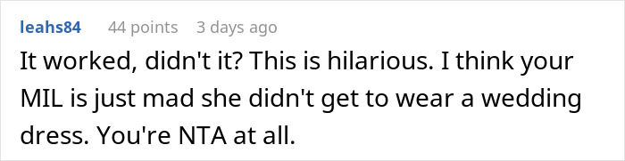 What was less funny, though, was choosing the wedding dress. “Oh boy, there was also drama with the dress,” the OP recalled. “Both moms had other ideas for what I should wear and, once again, I put my foot down and got the dress I wanted.”