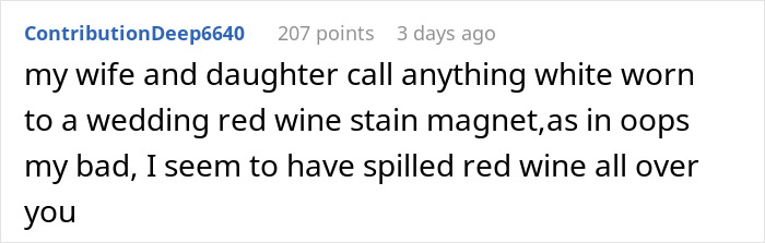 Load More Replies...Had a friend put a card in the invitation that wearing white would get you ejected from the wedding. Actually had a "bouncer" (friend) to escort offenders out. 2 girls were sent away, only 1 returned.