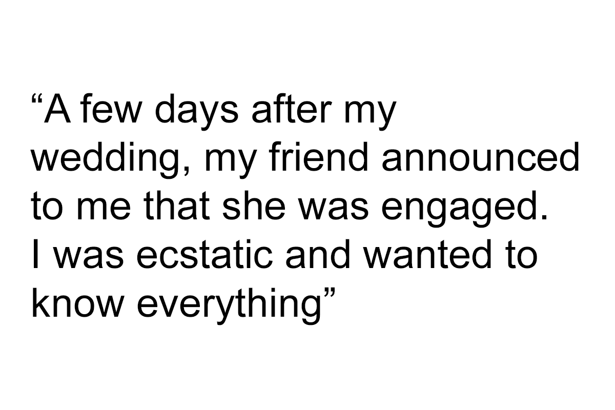 One such story comes from an upset bride whose friend “not only got engaged at my wedding but instead of hiding it and announcing it later, she announced it to our friends during the party.” In the author’s friend’s mind, “it’s no longer the day I got married, it’s now also the day she got engaged,” the bride wrote.