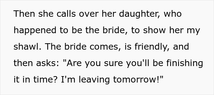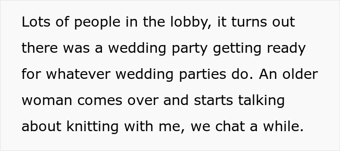 She was innocently knitting in the lobby and chatting to a random mom, when a bride, the mom’s daughter, rolled up and started making demands