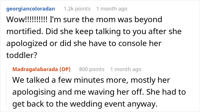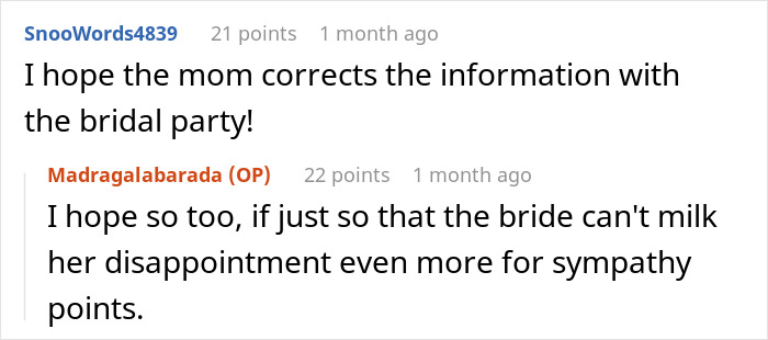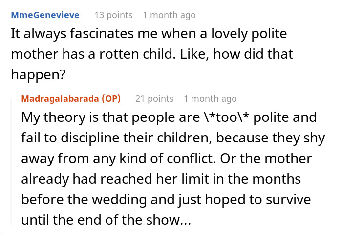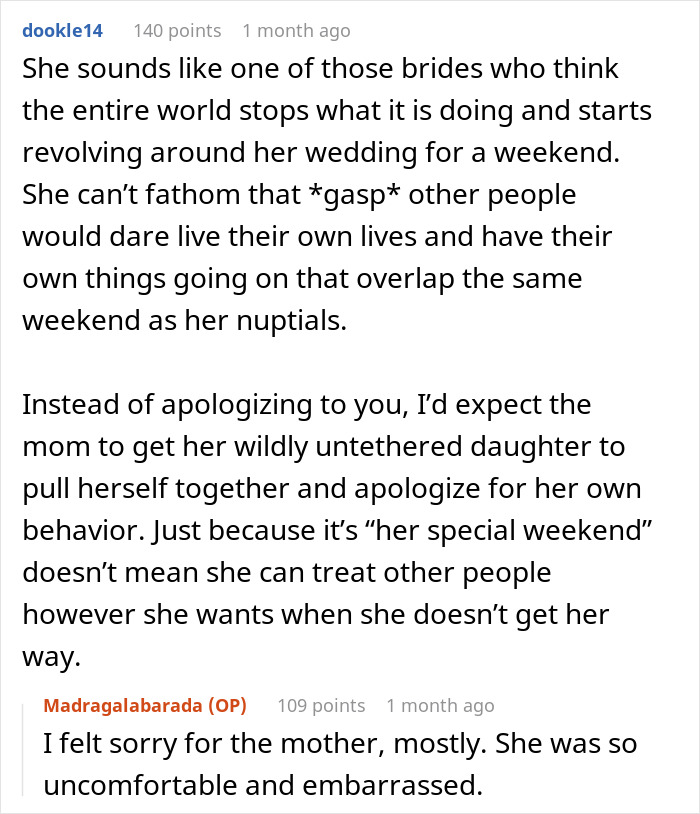 Apparently the mom was quite mortified by her daughter’s actions, apologizing profusely to the OP. Many, including the poster, speculated on why the bride is the way she is and two prominent guesses rose to the top.