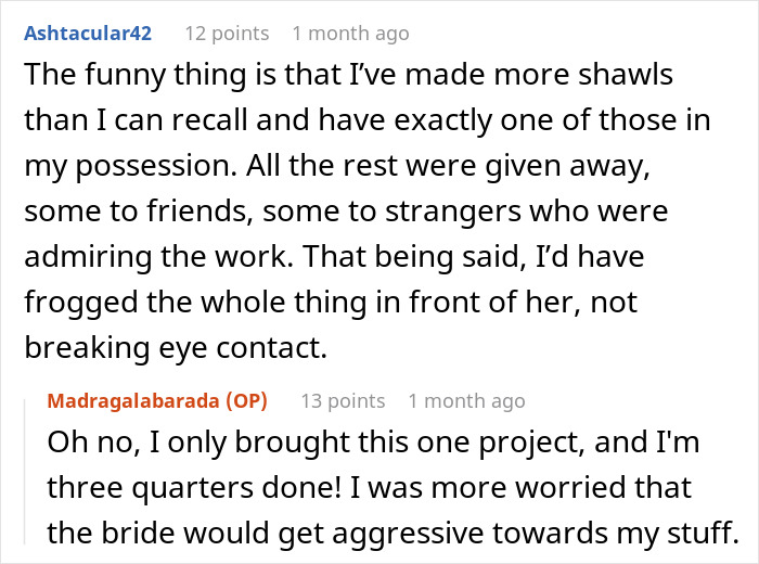 If you’re now feeling self-conscious about your knitting skills, fear not! OP says that she simply follows the pattern, which is very clearly written and it just works. Funnily enough, she’s also crocheted a ring in the past – it’s a good thing the bridezilla didn’t see it, as she would have probably tried to snag that too.