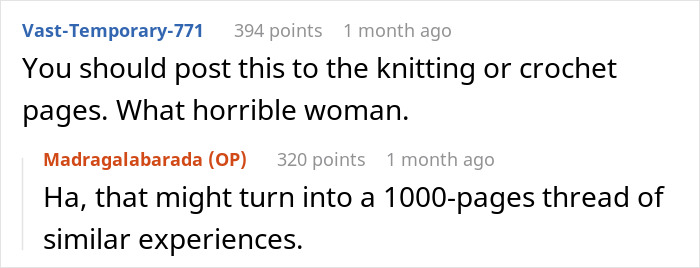 The other knitters were absolutely salivating in the comments and complimenting the original poster’s (OP) skills and choice of color.