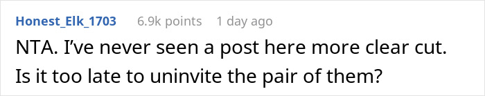 Load More Replies...As someone with oddly specific dietary issues, you pick the least complicated one. Eat what you can. Bring snacks. You’re there for the happy couple, not for the free food. You’re a grown man who can figure out how to feed himself. Uninvite the couple, it may only get worse day of and you don’t need stupid drama like this.