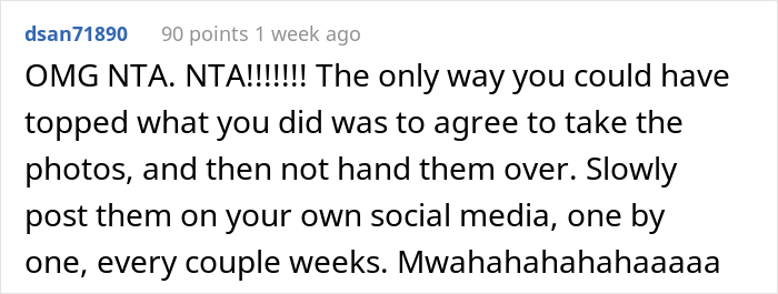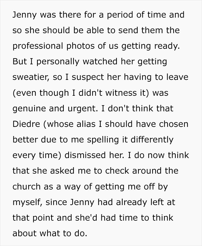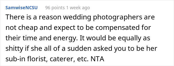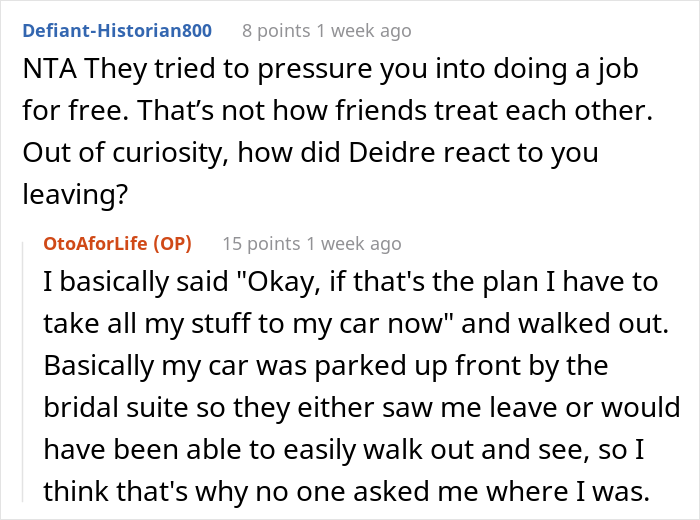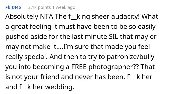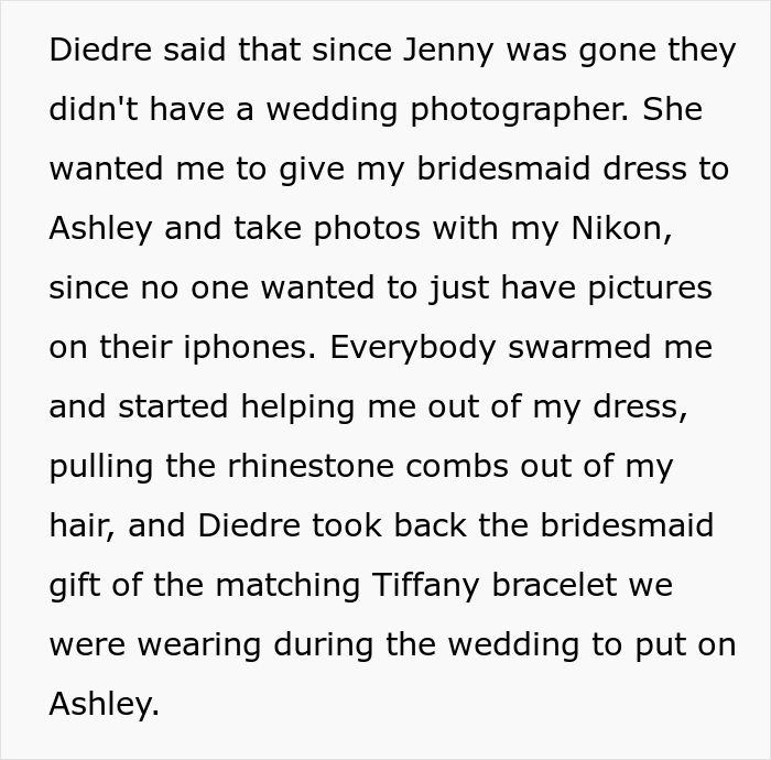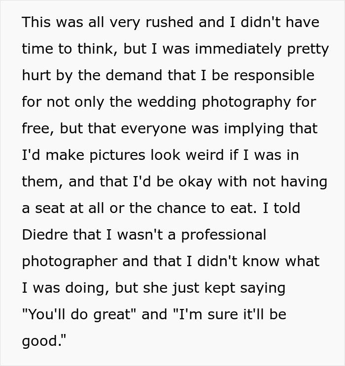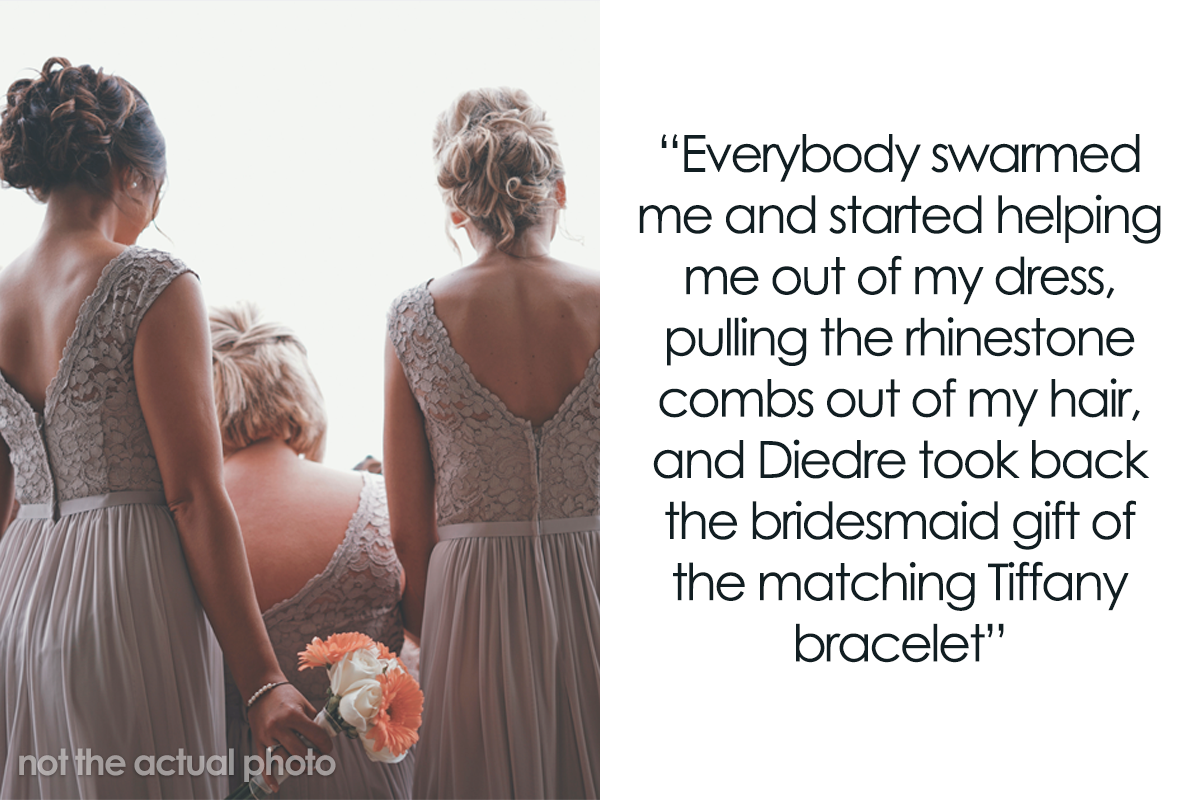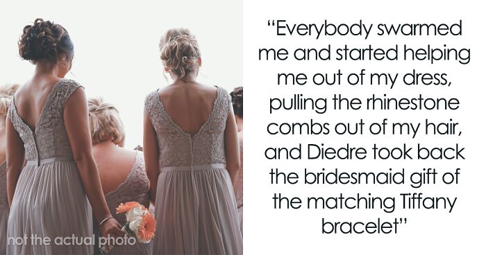 Load More Replies...Amen. I was demoted from maid of honor to regular bridesmaid once after helping with planning, paying for a bachelorette by myself, buying a new outfit, and doing the bride’s hair and makeup for free (I was in school to be a stylist at the time). All because the bride liked her cousin’s dress better than mine. Never again. People like that aren’t friends.