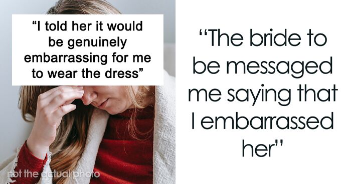 Load More Replies...This is why I said to my bridesmaids ‘Hey, I’m wearing X colour. Just show up in something that vaguely goes with it’. Because I had a disabled bridesmaid, a short skinny bridesmaid, a very large bridesmaid and there was no way a single style of dress was gonna work. I’ve turned down being a bridesmaid because the dress was a strapless tight number and my fat backside would fall out of it. And the bride demanded I lose weight and cover up my tattoos so…no.