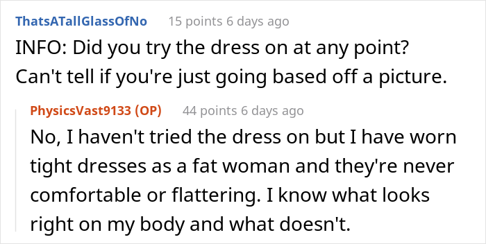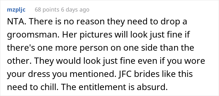 Load More Replies...Accidentally created a similar situation to this for my own wedding, & a bridesmaid told me bluntly what i was picking would not suit her. Felt terrible! In the end encouraged each friend to pick a dress under a broad theme in a different colour each, so they felt good in them, then gave them the ££ after. What is this brides problem making everyone have to be identical !? This person is a rubbish friend and an idiot - definitely NTA!!!