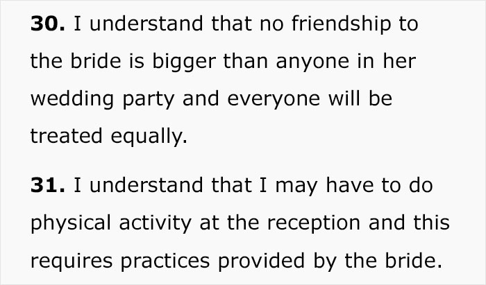 Load More Replies...I would sign it just so I could do the opposite of everything it said...then tell her to take me to Judge Judy over it while drinking my 8th cocktail on the lap of one of the groomsmen I just met and might bang later! 🤣😂🤣