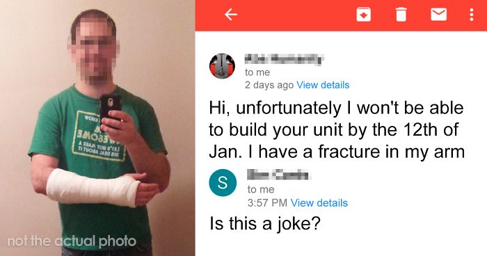 But it turns out that some people lack any empathy for their fellow man and are more akin to cold, unfeeling robots. Engineer, workshop owner, and contractor Abs Delfuego, who goes by the Reddit user name Omegaweapon, posted the emails between him and a client who got angry that he broke his arm and wanted him to finish the job as agreed, no matter what.