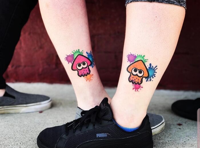 Brother and sister tattoos featuring cartoon characters holding guns on arms.