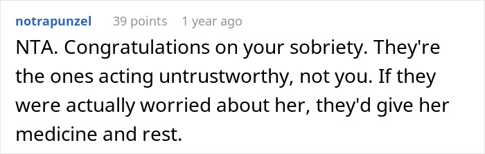 It’s absolutely clear that the couple doesn’t trust the mom, who wrote the Reddit post, to do anything right. Good intentions? Perhaps. Demeaning approach? Definitely. Ulterior motives? Maybe. Many members of the AITA community who read the story felt like the brother and SIL were trying to sabotage the mom’s recovery and relationship with her child. Some others speculated that the couple might even have been doing this to regain custody of the girl.