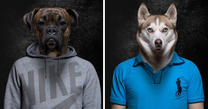 Bulgarian artist photographs 9 owners and their dogs and creates funny and creative photo collages.