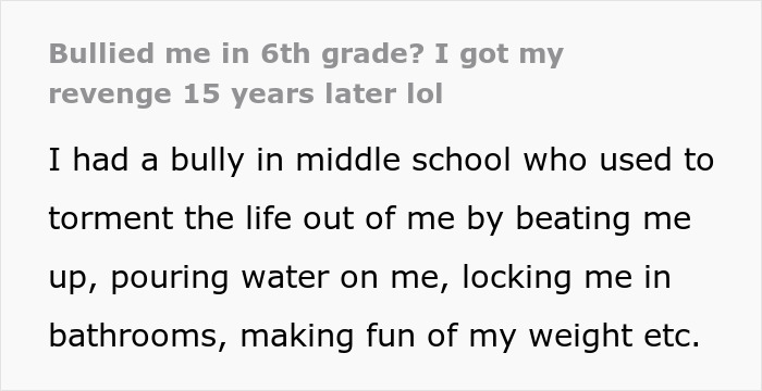 Load More Replies...I have absolutely no pity for bullies, so I totally love this little revenge plot.