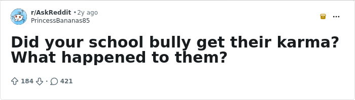 So we’ve gathered posts from people sharing what happened to their bullies, ranging from karma striking back later in life to folks who decided to fight back. Get comfortable as you scroll through, upvote your favorites and if you have any stories of your own that fit the bill, be sure to share them in the comments section down below.