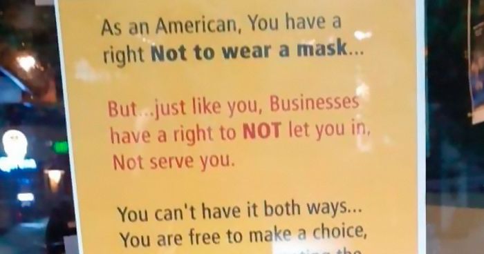 Not everyone is buying it. This poster was put up outside the entrance to an unidentified business that blew up on the internet. People couldn’t stop praising the mic drop-like text, which explained loud and clear why you should be ready to take consequences for not wearing a mask. Hint: no drink, no snack, no fun, see you at home.
