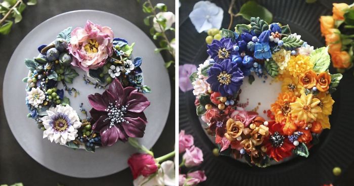 The Seoul-based pastry chef delicately sculpts edible floral bouquets that look truly too pretty to eat. With beautiful petals and exquisite arrangements, all of her creations look so much like flower bouquets, you could barely even tell they're actually buttercream cakes. Keep on scrolling to check them out and don't forget to vote for your favorites.
