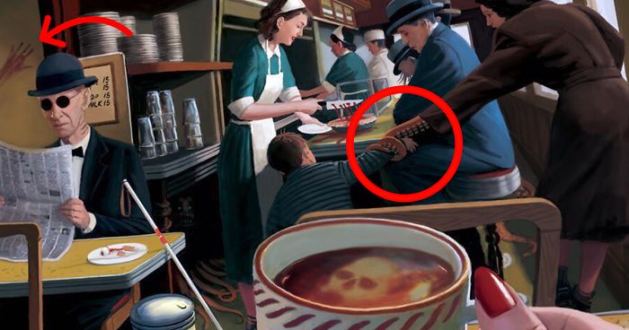 Grab your magnifying glasses and put your thinking hats on, because boy, do we have a hidden secrets hunt for you! Just hours ago, an oil painting went viral online, which at first glance seems like a depiction of an ordinary diner in the 40s or 50s. But if you look closer, you’ll see that there’s nothing normal about this creepy image whatsoever…