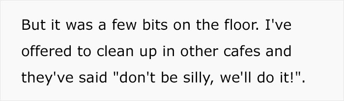 I went out with my nephews and niece endless times, even when they are little. I've never experienced something like this. But my nephews and niece really only ever left a few dry crumbs, never a real mess. But lately I was out with a friend and her baby and what she called a few crumbs was a cookie explosion I'd be ashamed to let my siblings kids make in a cafe. Some moms are really messy and don't see the problem. Far beyond what's reasonable. No one expects people to leave everything spotless. But if it's not possible to remove it with a short swipe with a broom you have made an unreasonable mess.