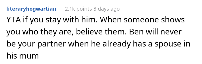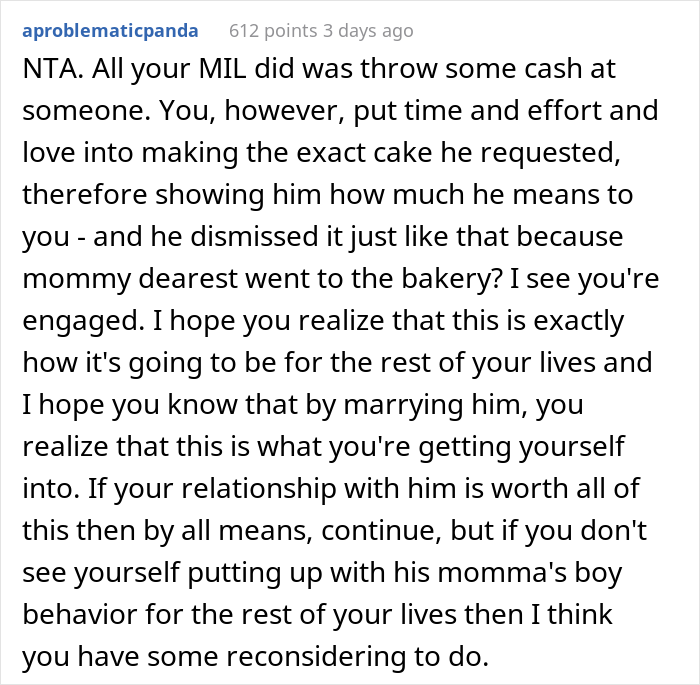 And so, this story found its way to the AITA community, who saw zero fault in OP and all the fault in the guy and his mom. For the most part, people sent pleas to not marry him. If that’s how he approaches the issue of cake, you can imagine how fast it’ll go south with other topics.
