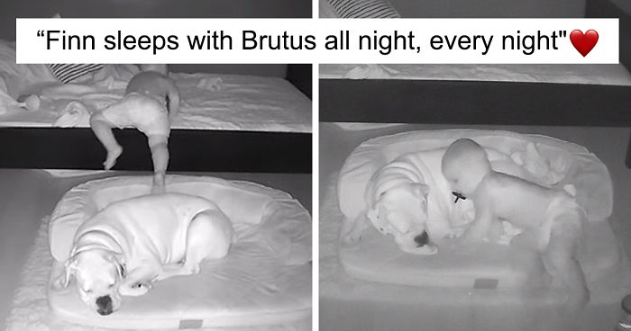 Mom Paige commented to Bored Panda that “Initially, Brutus would sleep on the rug in front of his crib every night.” But when Finn started sleeping in a bed, “Brutus began crawling up and sleeping in bed every night; it was as if he laid next to him to prevent him from rolling out of bed.” It’s only when Finn started climbing out of his bed that Brutus began sleeping next to him as well.