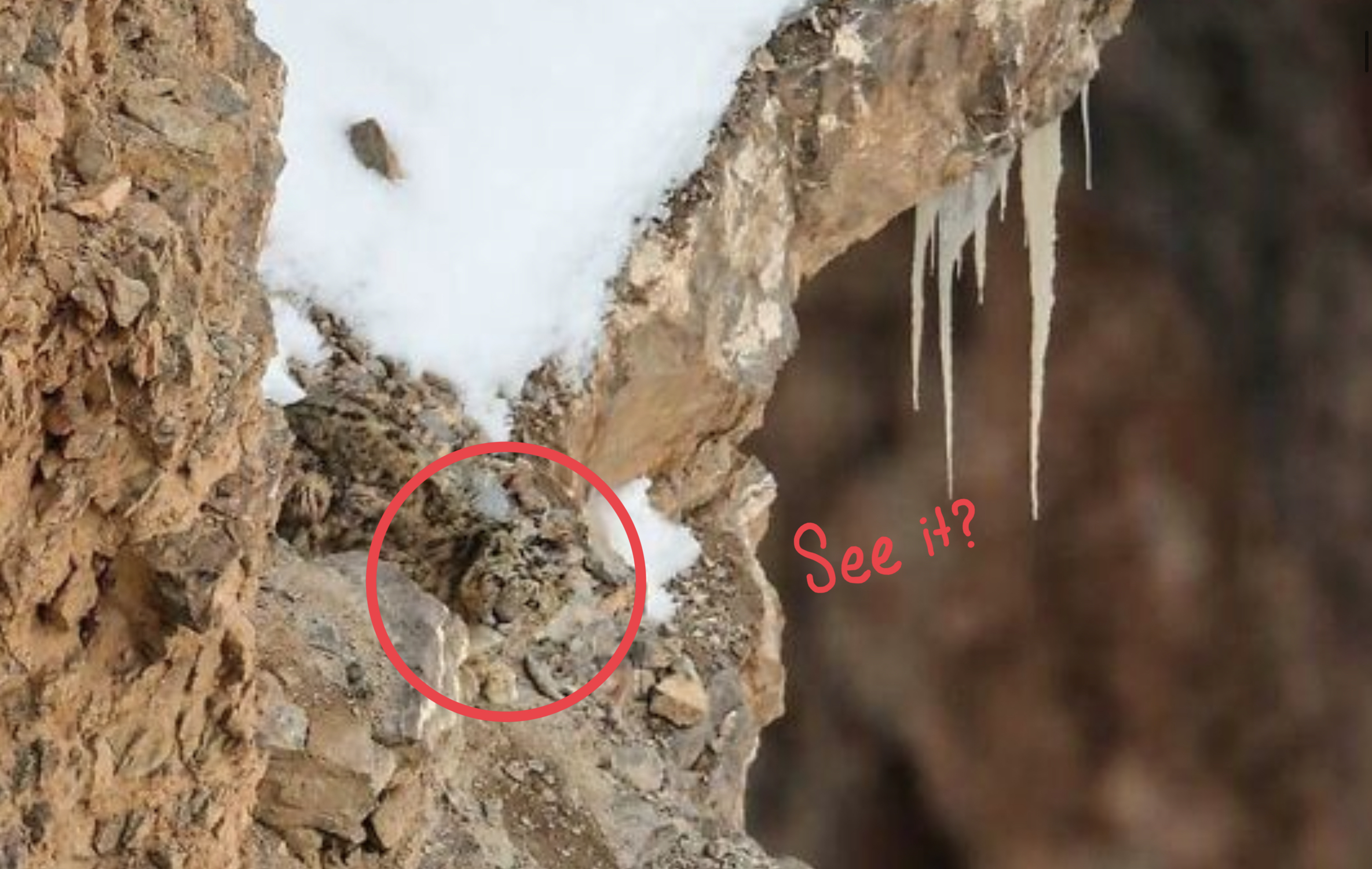 See the biggest patch if snow in the top 3rd? There's a little pointed part at the very bottom bit of that patch, it's pointed directly down (like a V) and just beneath it is the leopards head!