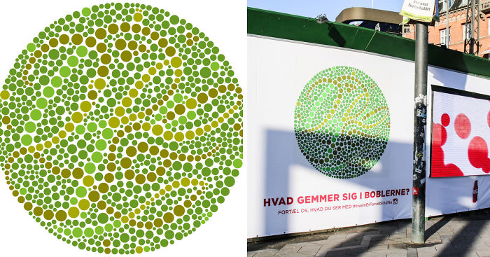 We were inspired by the so-called Ishihara images that only people with normal vision can read. They are normally used to test color-blindness. To make images that only color-blind people can decipher, we had to master the technically complicated task of developing reversed Ishihara images.