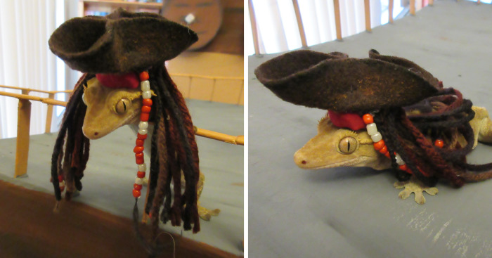 This year we had a pirate themed Halloween party. I was Davy Jones, my husband was Bootstrap Bill and I figured I shouldn’t leave my Crested gecko costume-less! Then suddenly I came up with the perfect idea…Captain Jack Gecko! I thought about the costume and figured all it would need was a bit of felt, some multi-coloured yarn, and a few beads. As with any adorable animal in a Halloween costume, he wasn’t too excited about it. Though he would humor me and leave it on for a couple minutes if he was in a comfortable enough spot!
