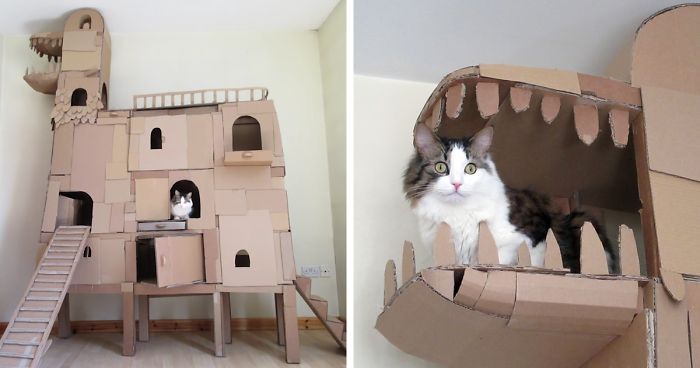 Human Builds A Dragon-Shaped Cardboard House For His Cat In Order To Please His Master
