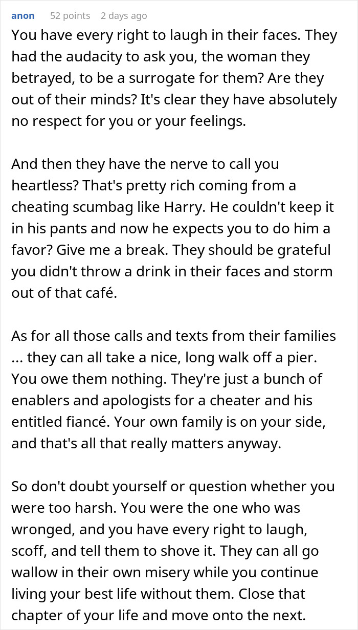Sometimes, when looking at their partner’s behavior, one might assume they have seen everything only to get proven wrong later on. This is when a person has to find the strength to “take it easy” for the sake of their own well-being – not giving more of one’s attention than necessary to a person like this and thus avoiding the mistake “of paying attention to the wrong people”, which Henry Cloud called one of the most expensive things a person can do. This seems to have been the response of this Redditor, who tried to keep it civil with her ex until he asked her to be a surrogate mother of three children for him and the woman he cheated with.