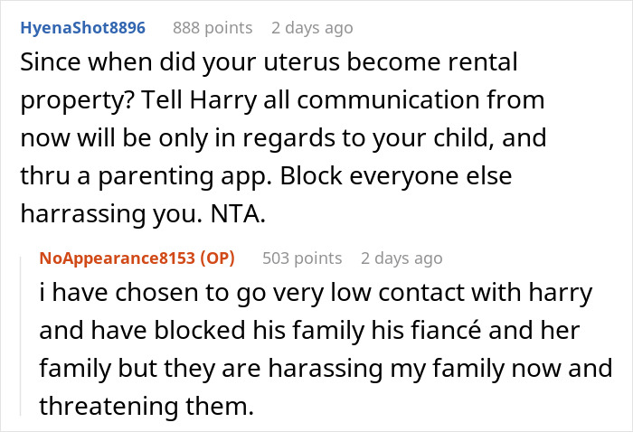 Load More Replies...Harry clearly thinks he has some ownership over the OP. I think when he was with her he was manipulating her and his partner was OK with it, I think the cheating started possibly before she was even pregnant. They clearly believe she is a pushover and that can only have developed if they had successfully manipulated her historically. She likely remained cordial for the child's sake to ensure her baby had a relationship with their father. That maturity was seen as an opportunity by Harry and his partner to push her around at their convenience. I can't see this level of entitlement springing out of the blue. These two are much worse and uglier inside than the OP realises imo. I hope she gets full custody and completely gets them out of her life, they are seriously deranged at this point.