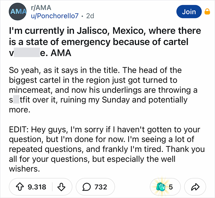 Amid a sea of chaos and some misinformation, one Mexican resident, who is caught up in the Jalisco state of emergency, has invited people to ask anything they want about the current crisis. The post garnered quite a lot of attention online. Bored Panda has selected the most interesting questions and answers for you to scroll through as this developing story unfolds.
