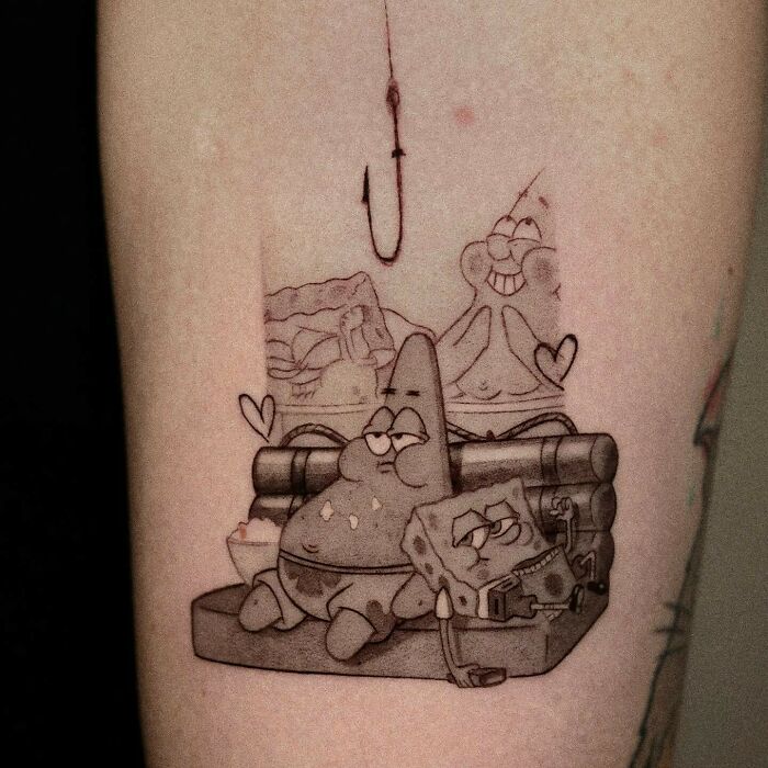 My best friend and I have matching tats of the lil fish from SpongeBob that cried Hooplah