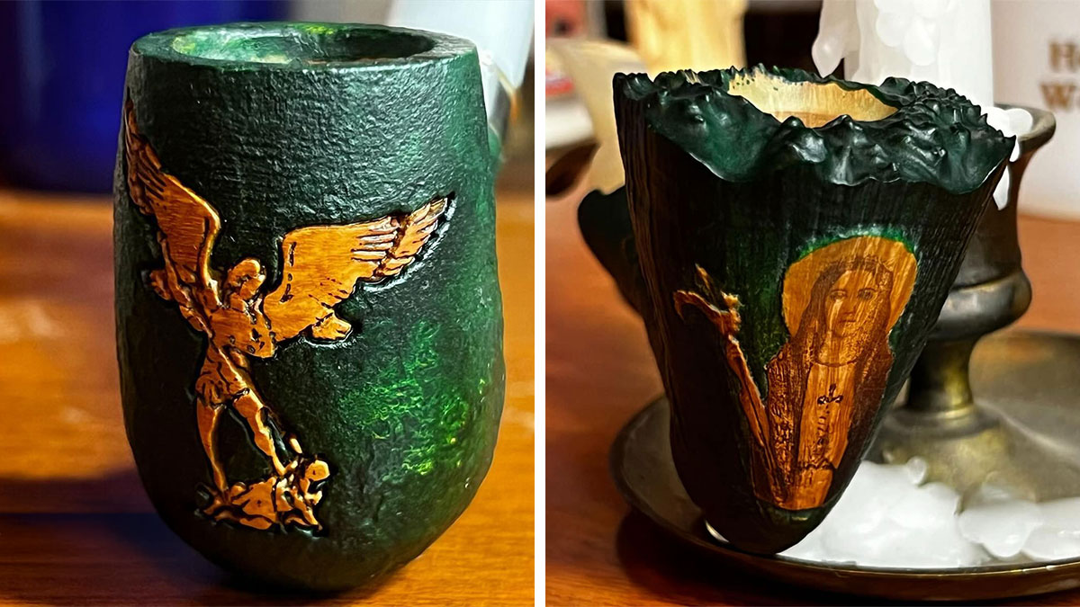 Caleb C. Mitchell’s pipes are more than functional—they’re small works of art that bring Catholic iconography into everyday life. Each piece is intricately carved and painted, transforming the stories of saints like Saint Sebastian, Saint Joseph, and Saint Thomas Aquinas into detailed, handheld tributes.