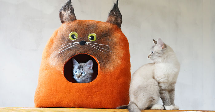 Delight your feline friends with these felt cat homes. Created by me, Indre Naujokiene, a felt designer, these “cat caves” are made with 100 percent soft merino wool. They come in delightful cat shapes.