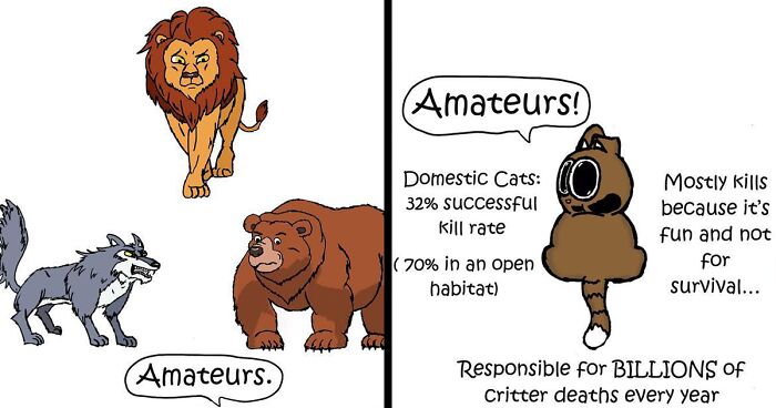 They leave a bloody, mangled, half eaten corpse for you to clean up and doubts about keeping such a ruthless devourer of wildlife in your home start to creep in but then they jump on your lap and purr and everything is fine.
