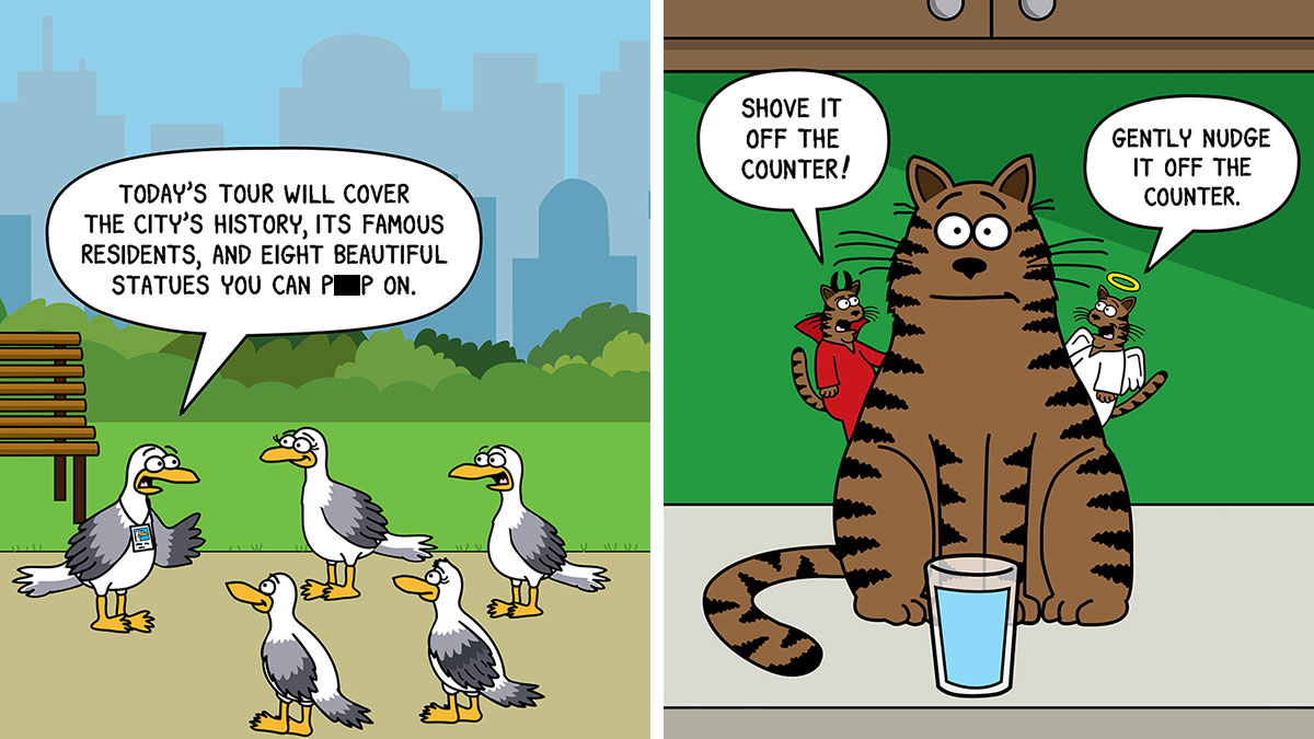 Back again with more Scott Metzger comics. If you’ve been following along, we’ve featured his work on Bored Panda many times before. Well, the vibes remain the same in this batch of comics: everyday pet life, distilled into sharp punchlines and expressions that feel way too real. Metzger has a knack for turning small moments into both comedy and a commentary on how different animals can share the same home and still act like they’re from completely different planets.