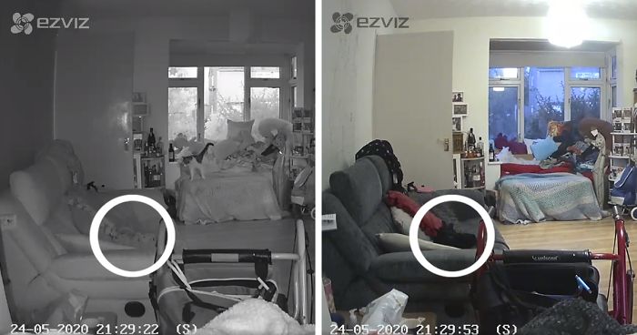 Chloe gave her own perspective to Bored Panda: “It was a normal day, had been out for a few hours, had just got in and went to check my two cats were in so I could open the front door back up to take the back seats for my partner’s stepdad’s minivan out to him without the cats running out the door and getting in the way. You can see I look at the sofa, but I didn’t notice anything out of the ordinary. It was only when I checked back on the camera (like I do any time we go out) that I noticed something weird, and it seemed like my cat, Blackjack, that passed away exactly a year ago.”