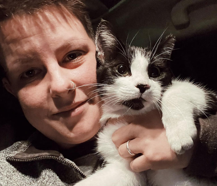 Whilst the adorableness was ongoing, Lauren got to have a closer look at the kitty. She said in a Facebook post that the cat was cold, dirty and “had a ton of scabs. Scrawnier than she looks in the photos too – shoulder blades and hip bones were really jutting out.”