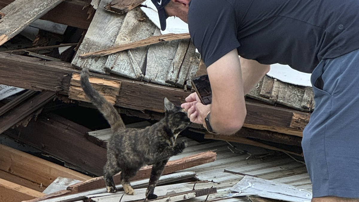 Ryan was first worried that the sound meant an animal had been stuck somewhere under the rubble, so, out of curiosity and his good heart, the man decided to come closer and investigate. “So I walked over to the debris, and the next thing you know, a little kitty emerges.”