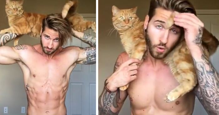 Travis DesLaurier, a male model from Edmonton, Alberta, has just discovered a purrfect way to get fit – he exercises together with his cat Jacob. “He [Jacob] doubles up as my training partner, medicine ball, and weight set,” DesLaurier writes on Instagram.