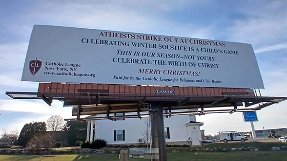 The FFRF responded to the billboard with a message on the micro-blogging site Bluesky, writing, “The scrooges at the Catholic League really know how to spread love and joy during the holiday season. Happy holidays!”