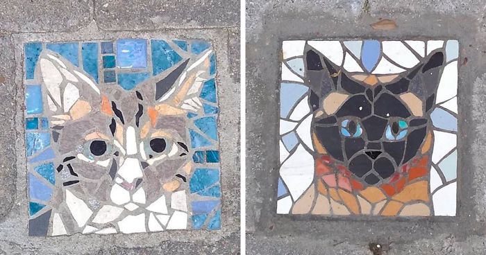 Turns out, one simple idea and a group of enthusiastic people can transform the whole town and turn it into a beautiful piece of art. That sort of what's happened with the neighborhood of Schaerbeek, located in the city of Brussels. It all started a few months ago when a Belgian artist named Ingrid Schreyers decided to decorate the sidewalk in front of her house with a mosaic. After seeing it, many locals fell in love with this idea and wanted to get their own personalized artworks installed in front of their houses. The government of Schaerbeek took the matters into their own hands and now they are installing personalized mosaics in the neighborhood free of charge. People are choosing all kinds of mosaics, though most of them seem to be decorating streets with portraits of their cats!