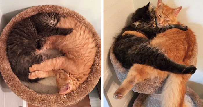 Ever since they were adopted, this bed was their favorite napping spot. Now that they’ve gotten bigger, they’ve obviously outgrown their beloved cuddle bed, but that doesn’t stop them! They can still squeeze in and cuddle. “Renley is usually the boss, so when he wants to cuddle – they cuddle. When he was little he used to meow and look for Lili if she wasn’t in the same room,” the kitties’ owner told Bored Panda. How cute!