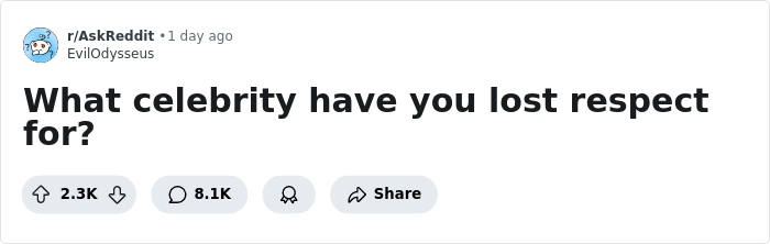 Someone recently asked, “What celebrity have you lost respect for?” and the internet went wild. The post clocked up over 8,000 comments, as people shared their opinions on why they think certain A-listers deserve to be canceled. Bored Panda chatted to the person who asked the billion-dollar question, to find out what inspired it. We also put together a list of the most popular answers. Upvote the ones that make you tick, and let us know in the comments who else you think should be added. Don't miss the chat we had with Roz Sheldon, the managing director of the global online reputation management company, Igniyte.